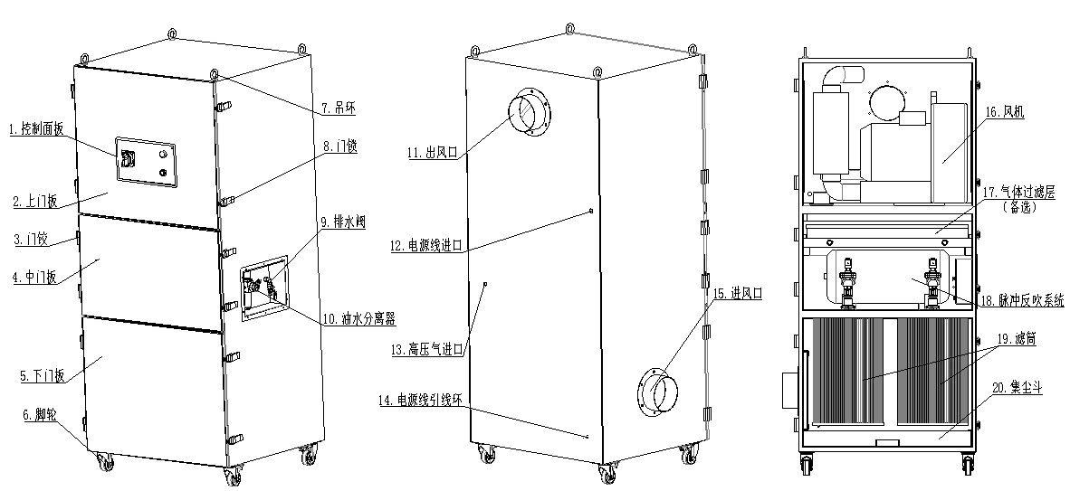 SRA-950XPF防爆脈沖反吹清灰凈化機高壓風(fēng)機和三層過濾系統(tǒng)組合而成。