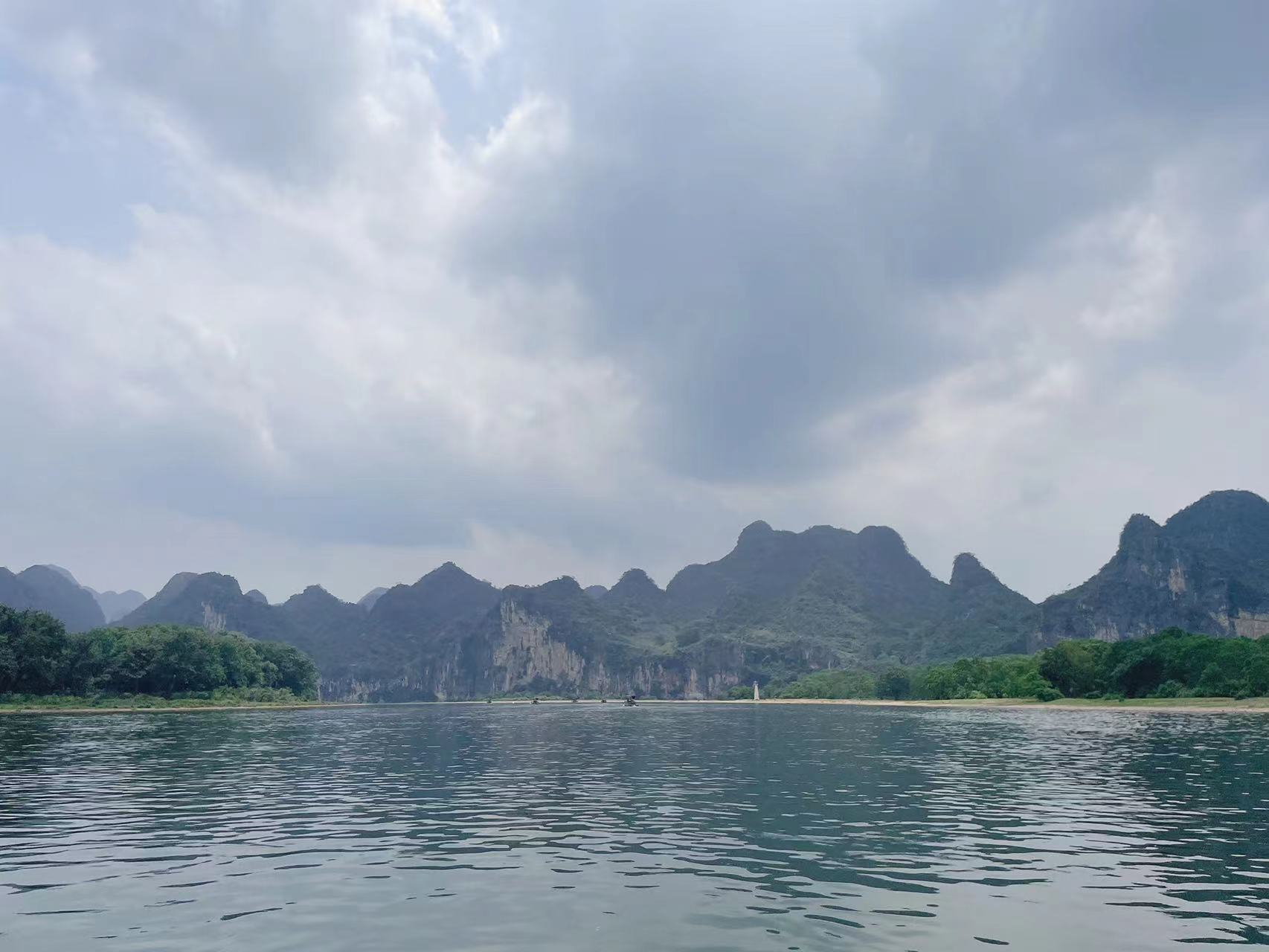 下午我們乘坐小竹筏,游覽漓江。兩岸山峰清秀迤邐,連綿起伏,形態(tài)萬千,江岸綠草如茵,翠竹蔥郁,樹木繁蔭。讓人仿佛進入了天人合一的詩意境界,返璞歸真的自由天地。